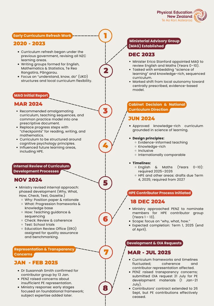 The timeline also records PENZ’s ongoing attempts to seek clarification and accountability. From early correspondence through to formal Official Information Act (OIA) requests, PENZ has sought to understand who was leading the writing process, what frameworks informed the design, and how subject associations were expected to contribute. Many of these questions remain unanswered to the satisfaction of the physical education community.